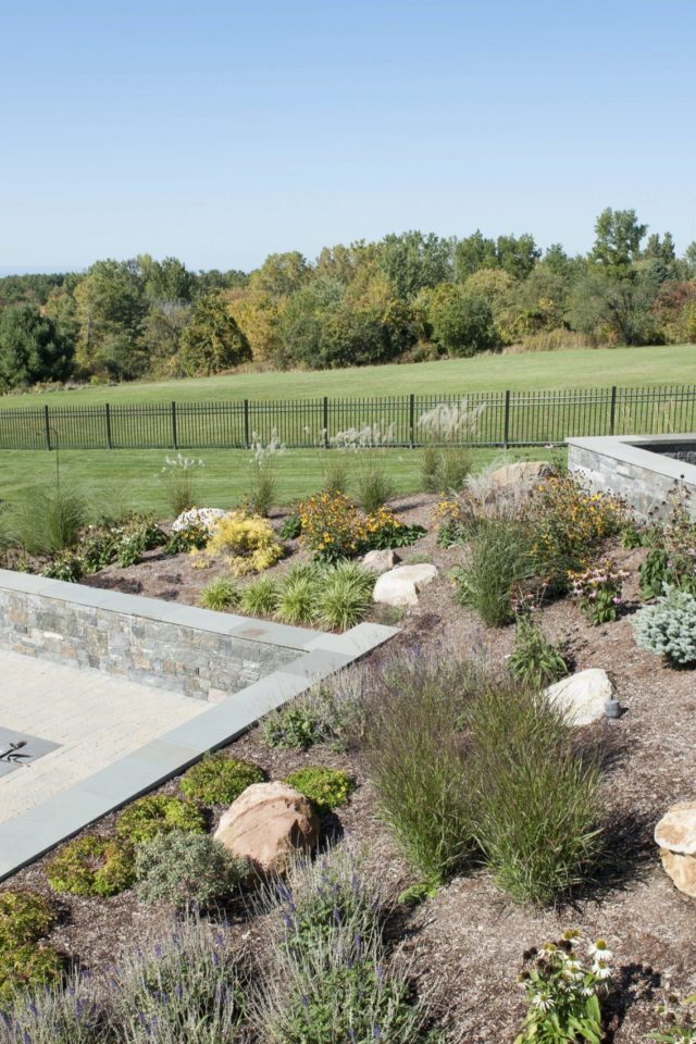 Large ornamental gardens soften the lines of the stonework with the use of shrubs, grasses, and multi-season blooming perennials. The perennials were chosen specifically for the client’s young daughters to gather into unlimited bouquets. A vegetable garden situated off to the side of the property lends plenty of opportunity for hands-on learning and harvesting fresh produce. It was essential to our clients that the gardens contain nothing fussy or high-maintenance, and that the plant material is able to withstand the occasional footstep or ball rolling through. The children’s swing-set and play ground is located just off the patio keeping them close, yet still giving them their own unique play area.